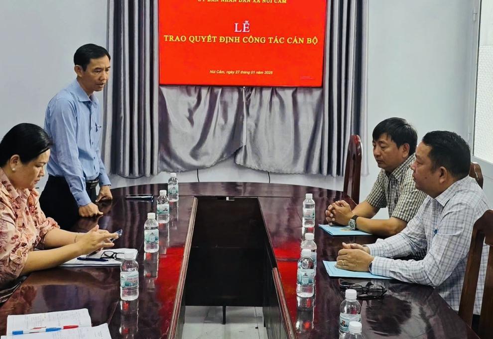 Sáng ngày 27/01/2026, UBND xã Núi Cấm tổ chức Lễ trao Quyết định công tác cán bộ, nhằm tiếp tục kiện toàn tổ chức bộ máy, nâng cao chất lượng đội ngũ cán bộ, công chức đáp ứng yêu cầu nhiệm vụ trong giai đoạn hiện nay. Đến dự buổi lễ có đồng chí Phan Thanh Tài - Phó Bí thư Đảng ủy - Chủ tịch UBND xã; đồng chí Lâm Thị Thu Vân- Ủy viên BTV Đảng ủy - Chủ tịch UBMTTQVN xã.