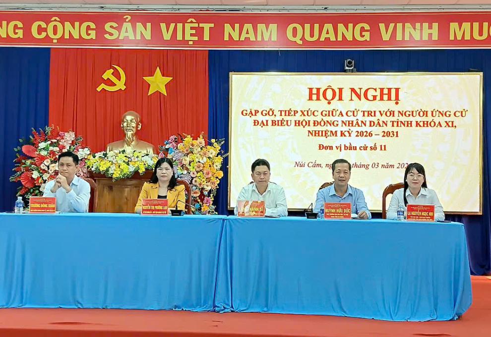 áng 03/03/2026, tại Hội trường UBND xã Núi Cấm, Ban Thường trực Ủy ban MTTQ Việt Nam xã Núi Cấm phối hợp UBND xã tổ chức Hội nghị tiếp xúc giữa cử tri và các ứng cử viên đại biểu HĐND tỉnh nhiệm kỳ 2026–2031, thuộc đơn vị bầu cử số 11.