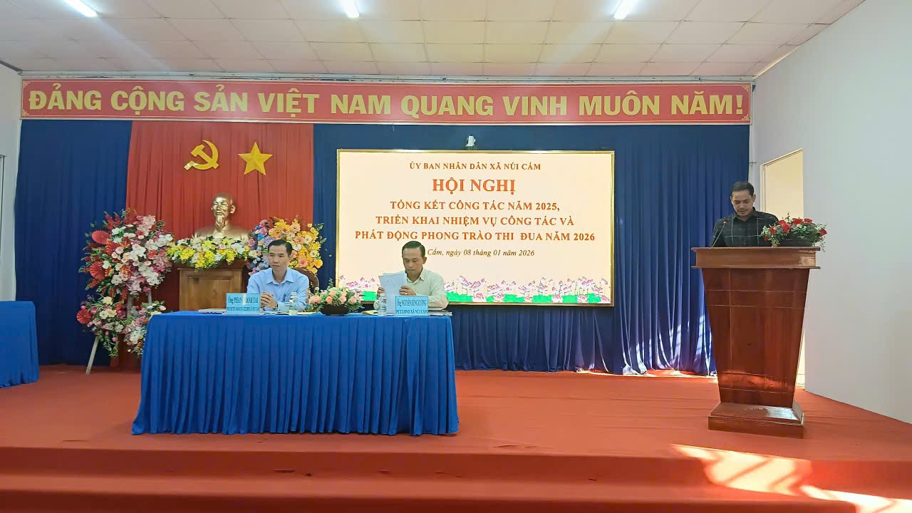 Ngày 08/01, UBND xã Núi Cấm tổ chức Hội nghị tổng kết công tác năm 2025, triển khai nhiệm vụ công tác và phát động phong trào thi đua năm 2026. Đến dự có đồng chí Đỗ Minh Sang Phó Bí thư Thường trực Đảng uỷ xã; đồng chí Phan Thanh Tài, Phó Bí thư Đảng uỷ, Chủ tịch UBND xã chủ trì hội nghị, các đồng chí trong Thường trực HĐND, UBND, Ủy ban MTTQ xã; lãnh đạo các cơ quan, đơn vị; Bí thư các chi bộ trực thuộc Đảng ủy xã.