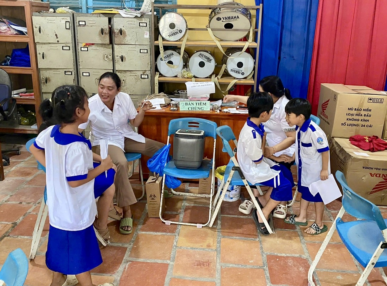 Theo đó, trẻ được cán bộ và nhân viên Trạm Y tế khám sàng lọc sức khỏe, các em học sinh được theo dõi 30 phút sau khi tiêm vắc xin, đồng thời, hướng dẫn giáo viên chủ nhiệm phối hợp cùng phụ huynh theo dõi sức khỏe của trẻ liên tục 2 ngày sau tiêm ngừa để kịp thời xử lý các trường hợp phản ứng sau tiêm.