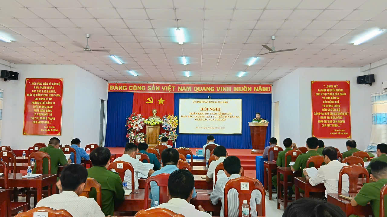 Chiều ngày 26/02/2026, UBND xã Núi Cấm tổ chức Hội nghị triển khai dự thảo kế hoạch đảm bảo an ninh chính trị, trật tự an toàn xã hội trên địa bàn năm 2026. Hội nghị nhằm đánh giá tình hình an ninh chính trị, trật tự an toàn xã hội thời gian qua, đồng thời đề ra các giải pháp chủ động phòng ngừa, đấu tranh, trấn áp các loại tội phạm, đảm bảo cho Nhân dân vui xuân, đón lễ an toàn, lành mạnh. Đến dự có đồng chí Phạm Văn Phúc - Bí thư Đảng ủy - Chủ tịch HĐND xã; đồng chí Phan Thanh Tài - Phó Bí thư Đảng ủy - Chủ tịch UBND xã.