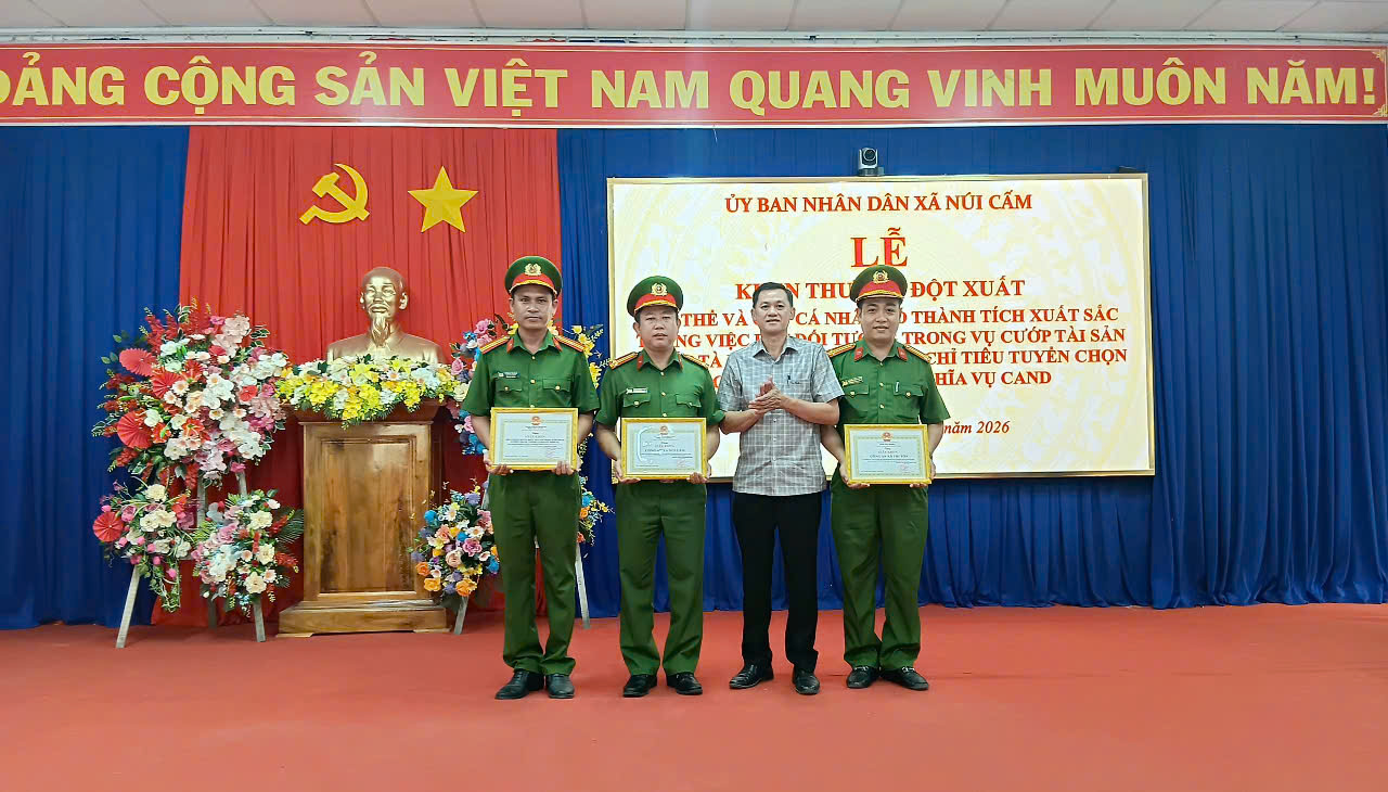 Nhân dịp này, lãnh đạo địa phương đã trao Giấy khen đột xuất cho 03 tập thể và 05 cá nhân có thành tích xuất sắc trong công tác truy xét nhanh, bắt giữ đối tượng gây án trong vụ cướp tài sản xảy ra ngày 21/02/2026 tại ấp Tà Lọt, xã Núi Cấm, tỉnh An Giang. Chỉ trong thời gian ngắn sau khi tiếp nhận tin báo, lực lượng Công an đã khẩn trương triển khai đồng bộ các biện pháp nghiệp vụ, nhanh chóng xác minh, truy xét và bắt giữ đối tượng, góp phần ổn định tình hình dư luận, củng cố niềm tin của Nhân dân đối với lực lượng Công an.