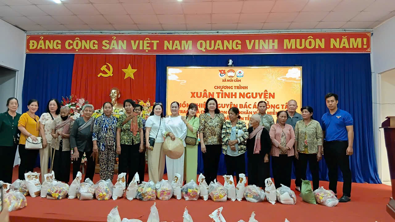 Hưởng ứng chương trình “Xuân tình nguyện - Tết yêu thương” năm 2026. Vừa qua, Đoàn thanh niên xã Núi Cấm phối hợp cùng Nhóm thiện nguyện Bác Ái Đồng Tâm – Phường Long Xuyên (tỉnh An Giang) tổ chức trao 100 phần quà cho hộ có hoàn cảnh khó khăn trên địa bàn xã. Tham dự buổi trao quà có bà Lâm Thị Thu Vân, Ủy viên Ban thường vụ Đảng ủy- Chủ tịch Uỷ ban MTTQVN xã Núi Cấm; bà Nguyễn Thị Thu Hiền – Trưởng nhóm thiện nguyện Bác Ái Đồng Tâm, cùng các tình nguyện viên.