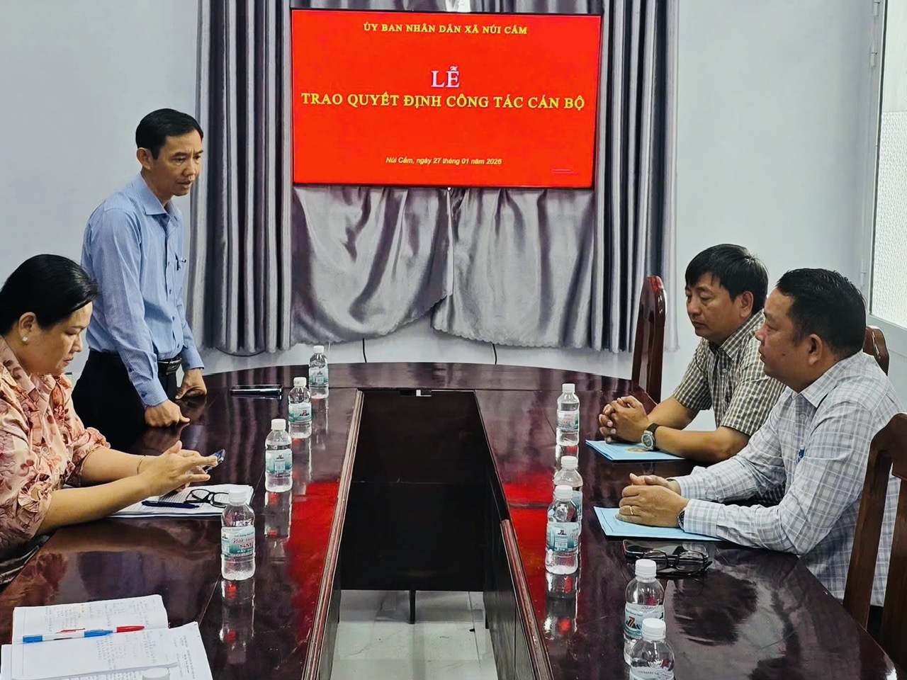 Tại buổi lễ, đại diện lãnh đạo Phòng Văn hóa - Xã hội xã công bố Quyết định của Chủ tịch UBND xã Núi Cấm gồm: Quyết định tiếp nhận ông Phan Văn Khoa công chức thuộc Ủy ban MTTQ Việt Nam xã đến nhận công tác tại Phòng Văn hóa - Xã hội và bổ nhiệm giữ chức vụ Phó Trưởng phòng Văn hóa - Xã hội xã Núi Cấm kể từ ngày 26 tháng 01 năm 2026; Quyết định tiếp nhận và phân công ông Nguyễn Văn Dũng công chức thuộc Ủy ban MTTQ Việt Nam xã đến nhận công tác tại Phòng Kinh tế xã Núi Cấm kể từ ngày 26 tháng 01 năm 2026, nhiệm vụ cụ thể do thủ trưởng đơn vị phân công.