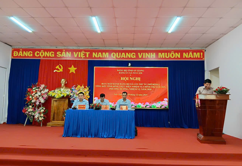 Chiều ngày 29/12/2025, Đảng ủy xã Núi Cấm tổ chức Hội nghị Ban chấp hành Đảng bộ xã lần thứ tư (mở rộng), nhằm tổng kết đánh, giá kết quả thực hiện nhiệm vụ chính trị năm 2025 và đề ra phương hướng, nhiệm vụ năm 2026. Đến dự có đồng chí Nguyễn Mạnh Hà, Phó Trưởng ban Tuyên giáo và Dân vận Tỉnh ủy An Giang; đồng chí PhChiều ngày 29/12/2025, Đảng ủy xã Núi Cấm tổ chức Hội nghị Ban chấp hành Đảng bộ xã lần thứ tư (mở rộng), nhằm tổng kết đánh, giá kết quả thực hiện nhiệm vụ chính trị năm 2025 và đề ra phương hướng, nhiệm vụ năm 2026. Đến dự có đồng chí Nguyễn Mạnh Hà, Phó Trưởng ban Tuyên giáo và Dân vận Tỉnh ủy An Giang; đồng chí Phạm Văn Phúc, Bí thư Đảng ủy – Chủ tịch HĐND xã chủ trì hội nghị; cùng tham dự có đồng chí Đỗ Minh Sang, Phó Bí thư Thường trực Đảng ủy; đồng chí Phan Thanh Tài, Phó Bí thư Đảng ủy – Chủ tịch UBND xã.ạm Văn Phúc, Bí thư Đảng ủy – Chủ tịch HĐND xã chủ trì hội nghị; cùng tham dự có đồng chí Đỗ Minh Sang, Phó Bí thư Thường trực Đảng ủy; đồng chí Phan Thanh Tài, Phó Bí thư Đảng ủy – Chủ tịch UBND xã.