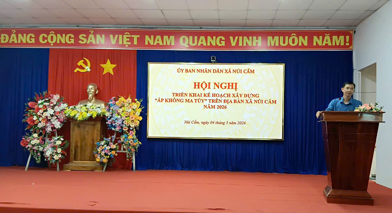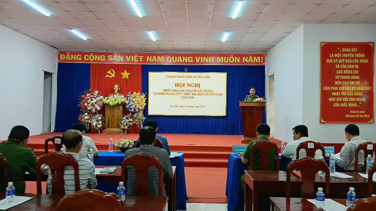 Nhằm tăng cường công tác phòng, chống tệ nạn ma túy, giữ vững an ninh trật tự và xây dựng môi trường sống an toàn, lành mạnh cho Nhân dân. Sáng ngày 04/03/2026, UBND xã Núi Cấm tổ chức Hội nghị triển khai kế hoạch xây dựng mô hình “Ấp không ma túy” trên địa bàn toàn xã. Đến dự hội nghị có đồng chí Đỗ Minh Sang - Phó Bí thư Thường trực Đảng ủy xã; đồng chí Phan Thanh Tài - Phó Bí thư Đảng ủy - Chủ tịch UBND xã; đại diện lãnh đạo các phòng, ban, ngành, đoàn thể; lực lượng Công an, Quân sự xã; Trưởng 11 Ban ấp cùng tham dự.